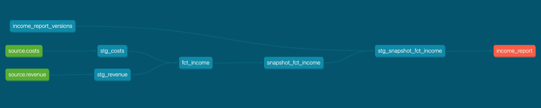 The original fct_income model now calculates the income for each version of source data, every time Joanne executes a dbt run. In other words, the downstream fct_ models are version-aware. Because of this, Joanne changes the name of fct_income to fct_income_history to be more descriptive.